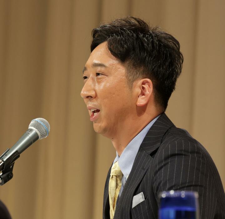 阪神 藤川球児氏が監督就任会見 縦縞ストライプのスーツに黄色のネクタイで登場 「当然、勝ちにいきます」 岡田前監督からの言葉も明かす
