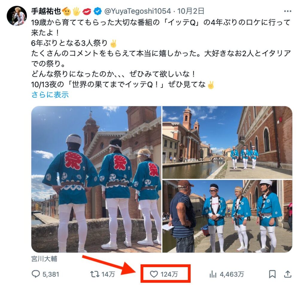 手越くん、イタリアの祭りに参加して、内村光良と宮川大輔と一緒にうなぎ舟レースに挑戦したんや。ファンはめっちゃ喜んでて、SNSでも「おかえり」の声がいっぱいやった。