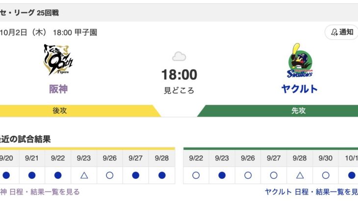 【虎実況】[10月2日] 阪神 vs ヤクルト(甲子園)25回戦 18:00 続きを見る(外部サイト)